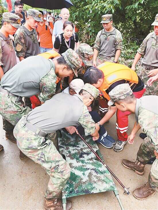 7月29日,天津警备区组织官兵和民兵在蓟州区下营镇转移受伤群众。新华社发 |
