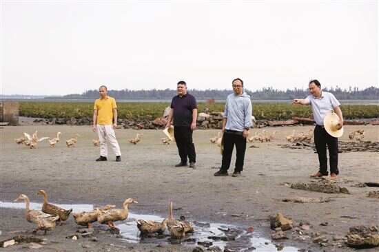 ■吴海进(左二)在后海村了解海鸭产业的发展情况,跟工作队一起商量如何拓展销路。 |