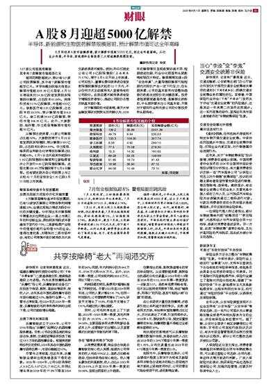 半导体、新能源和生物医药解禁规模居前,预计解禁市值可达全年高峰 8月将迎来A股市场解禁潮,预计解禁市值超5000亿元,到达全年最高峰。从行业分布看,半导体、新能源和生物医药三大领域解禁规模
