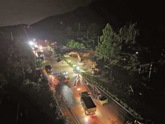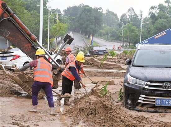 ■8月5日,救援人员在广东省肇庆市端州区清理淤泥。新华社发 |