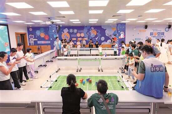 当少儿图书馆遇上科技发展中心 新快报讯 记者陈慕媛报道 近日,由广州少年儿童图书馆、广州市科学技术发展中心携手打造的广州少年儿童图书馆广州青少年科技馆分馆正式开放,同步举行的立体图书探秘、科学家故事分享、机器狗炫技、足球机器人对决等系列精彩活动,让孩子们在科技馆里解锁了阅读新体验。 分馆藏身于充满科技氛围的科技馆内,面积约70平方米,新上架4000册图书涵盖科普读物、儿童文学、绘本、体育、百科知识等,特别设置的“科学家故事”“趣味数学”“喜迎十五运”等专架让孩子们在阅读中触摸科学脉络。