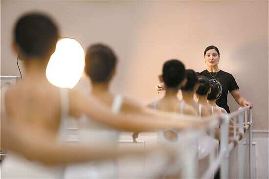 ■热尼娅带女孩们在把杆上练习Frappé。 |