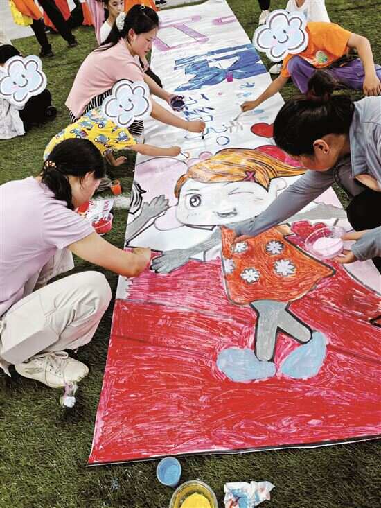 ■在从化区亲子交流活动中,孩子和家长配合完成巨画。 |