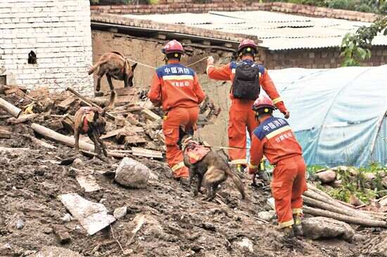 ■8月9日,消防员在榆中县马坡乡旧庄沟村利用搜救犬搜救失联人员。新华社发 |