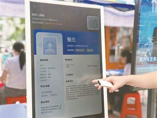 ■7月31日,广州市荔湾区华林街道零距离专场招聘会在上下九就业驿站门前举办,工作人员向群众介绍AI就业面试机。 |