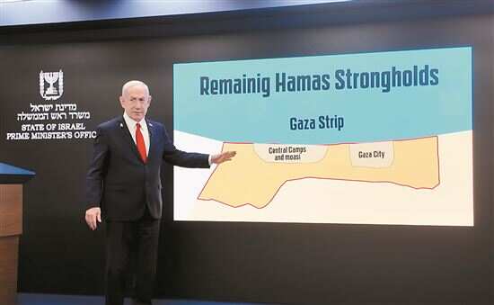 ■8月10日,以色列总理内塔尼亚胡在耶路撒冷举行的记者会上用手指向屏幕中的加沙地带地图。新华社发 |