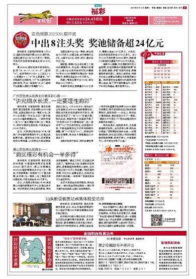 快乐8 第2025213期 中奖号码 02 08 19 20 21 22 26 31 37 38 39 40 49 52 54 59 71 73 74 76 奖等 单注奖金 选十中十 0 选十中九 8000 选十中八 800 选十中七 80 选十中六 5 选十中五 3 选十全不中 2 选九中九 300000 选九中八 2000 选九中七 200 选九中六 20 选九中五 5 选九中四 3 选九全不中 2 选八中八 50000 选八中七 800 选八中六 88 选八中五 10 选八中四 3 选八全不中 2 奖等 单注奖金 选七中七 10000 选七中六 288 选七中五 28 选七中四 4 选七全不中 2 选六中六 3000 选六中五 30 选六中四 10 选六中三 3 选五中五 1000 选五中四 21 选五中三 3 选四中四 100 选四中三 5 选四中二 3 选三中三 53 选三中二 3 选二中二 19 选一中一 4.6 全国投注总额:122113020元 广东投注总额:11539912元 下期选十奖池累计金额:16313850.35元 下期共用奖池累计金额:30000000元 兑奖期限:自开奖之日起60个自然日内。 福彩3D 第2025213期 中奖号码 3 8 1 奖等 中奖注数 单注中奖金额 单选 1525 1040 组选3 0 346 组选6 4499 173 1D 928 10 2D 26 104 通选1 0 470 通选2 12 21 包选三全中 0 693 包选三组中 0 173 包选六全中 0 606 包选六组中 8 86 和数12 79 15 本期销售额:3713846元 中奖总金额:2378436元 奖池金额:6693185元 兑奖期限:自开奖之日起60个自然日内。