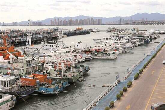 ■13日中午,台风“杨柳”登陆台东,随后向闽南粤东靠近,这是船只停靠在厦门高崎闽台中心渔港躲避台风。新华社发