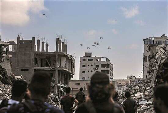 8月8日,飞机在加沙城上空空投物资。 新华社发 |