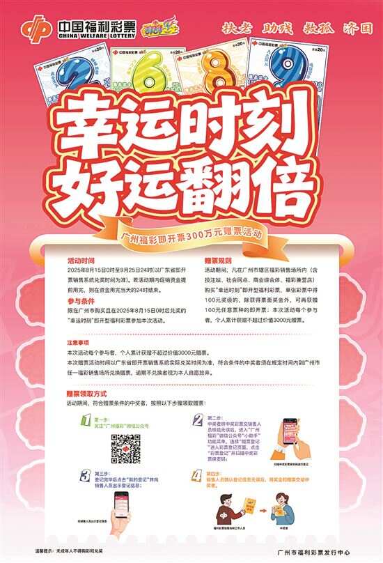 广州福彩刮刮乐300万赠票活动8月15日开启 新快报讯 记者陆妍思 通讯员郭新庆报道 福彩刮刮乐家族再迎新成员——“幸运时刻”。为庆祝“幸运时刻”即开票上市,回馈广大购彩者,广州市福利彩票发行中心决定自8月15日0时起在全市范围内开展“幸运时刻 好运翻倍”即开型福利彩票300万元赠票营销活动。 “幸运时刻”这款新游戏为系列票,共有10个票面,从数字0至9,每个数字不同的颜色,是一款以10个造型可爱的“创意卡通数字”为画面设计的时尚娱乐主题游戏。10张画面采用五彩缤纷且舒适自然的糖果色,带来温馨与欢快的感受,每个卡通数字分别搭配相应寓意的祝福成语,传递出对生活的美好祝愿。 据了解,刮刮乐新游戏“幸运时刻”面值20元,共设置10个奖级,最高奖金为100万元,玩法规则非常简单:刮开覆盖膜,如果刮出任何奖金金额,即可获得该奖金;如果刮出“四叶草”图符,即可获得100元奖金。中奖奖金兼中兼得。 相关 怎样参与活动? 在广州市福彩销售场所内购买且在8月15日0时后兑奖的“幸运时刻”即开票,即可参加本次活动。 活动期间,对“幸运时刻”即开票单张彩票中得100元的中奖者,除获得票面奖金外,额外赠送价值100元的即开型福利彩票(不限票种)。本次活动每个参与者(参与赠票登记的微信账号)累计获赠的赠票价值不超过3000元。 本次活动共安排赠票资金300万元,计划至9月25日24时结束;若活动期内赠票资金提前发放完毕,则在300万元赠票金发完的当日24时停止。 怎样领取赠票? 活动期间,符合赠票条件的中奖者,按照以下步骤领取赠票: 1.关注“广州福彩”微信公众号,点击下方菜单栏【小助手】选择【赠票登记】功能菜单后进入赠票登记页面,点击赠票页面的“扫一扫”功能,扫描符合赠票条件的中奖彩票【保安码】进行登记。正确扫描后系统会登记中奖彩票信息。 2.登记完毕后点击【我的登记】并向销售人员出示登记信息。销售人员核对无误后,将中奖奖金和赠票交给中奖者。活动期间,每个赠票登记的微信账号登记次数不超过30次。 广州福彩温馨提醒,本次赠票活动时间以销售系统实际兑奖时间为准,符合条件的中奖者须在规定时间内到广州市福彩销售场所兑换赠票,逾期不兑换者视为本人自愿放弃。