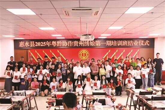 新快报讯 记者曾贵真 通讯员白小婷报道 日前,为期20天的贵州黔南惠水县粤黔协作贵州绣娘第一期培训班圆满结业。广东省粤黔协作工作队黔南工作组惠水小组组长,惠水县委常委、副县长李凌波出席结业仪式,对学员们的学习成果表示肯定,并为优秀绣娘颁发奖金。 在粤黔协作惠水小组的推动下,国家级非物质文化遗产广绣市级代表性传承人、“大国非遗工匠”王新元带队走进惠水授课。培训以“广绣+枫香染”非遗融合为特色,经过20天的精心指导,50名绣娘成功展示了各自的结业作品。 “王新元大师这次培训在文化传承、市场推动和融合创新等方面都带来了积极影响。”枫香染技艺州级非遗传承人冉光津在接受新快报记者采访时表示,非常感激粤黔协作惠水小组搭建了这样的平台,让广州的非遗大师和企业到贵州提供帮扶。冉光津介绍说,在王新元大师的指导下,目前正以“广绣+枫香染”非遗融合的方式进行产品研发,如结合惠水好花红刺梨花等本地元素,做出胸针、扇子等特色产品出来。将通过广绣市场的带动,拓宽枫香染产品销售渠道。这次培训还带动了当地妇女的就业。 接下来,惠水县相关部门将积极对接企业订单,搭建销售平台,培育合作组织,推动“培训—创作—销售”的构建,实现从“卖产品”到“创收益”的跨越,助力惠水县“指尖经济”的蓬勃发展,为乡村产业振兴注入新的活力。