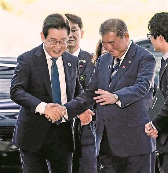 ▲8月23日,日本首相石破茂(右)在东京首相官邸迎接韩国总统李在明。新华社发 |