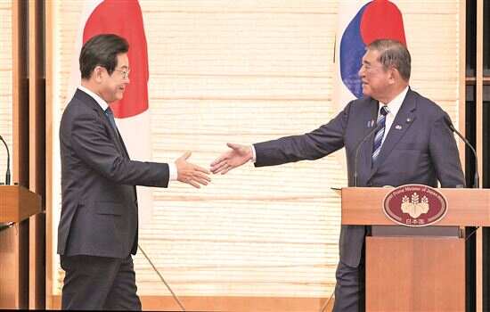 8月23日,在日本东京,韩国总统李在明(左)与日本首相石破茂在共同记者会后握手。 新华社发 |