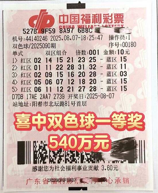 阳江一位幸运彩民的经历是这样的—— 新快报讯 记者陆妍思 通讯员郑惠文报道 中国福利彩票双色球第2025090期开奖,当期全国共中出一等奖51注,单注奖金540万元。其中一注花落广东省阳春市北坛路81号的44140246福彩销售站点,中奖彩票为一张10元5注单式票。 近日,幸运中奖者刘女士(化名)前来阳江市福彩中心办理兑奖手续。谈及中奖经历,刘女士说:“购彩那天心情一般,正好路过福彩销售站点,想让自己开心一点,就买了一张10元5注的彩票,当哄哄自己。”刘女士说自己有个习惯,每逢喜宴收到红包时,都会拿出20元以内的钱买彩票,“中不中都算给生活添点乐趣,也是做公益”。 据刘女士介绍,由于平时工作较忙,她常常忘记核对彩票。购彩三天后,当她再次经过44140246福彩销售站点时,看到站点门口“本站喜中双色球540万”的横幅,才想起几天前买的彩票还没对奖。“马上查看当期开奖结果,看到开奖号码和手中的彩票号码完全相同,手一直在抖,反复确认了好几遍,才敢相信自己真的中了大奖!”刘女士笑言,那一会心跳声大得仿佛连自己都听得到。 谈及奖金的使用规划,刘女士表示:先还清房贷,减轻压力,剩余资金存入银行,作为孩子的教育金及父母的养老备用金。“中奖是锦上添花,日子还得脚踏实地过。”刘女士提醒彩友们:量力而行,理性购彩,才能把幸运变成幸福。