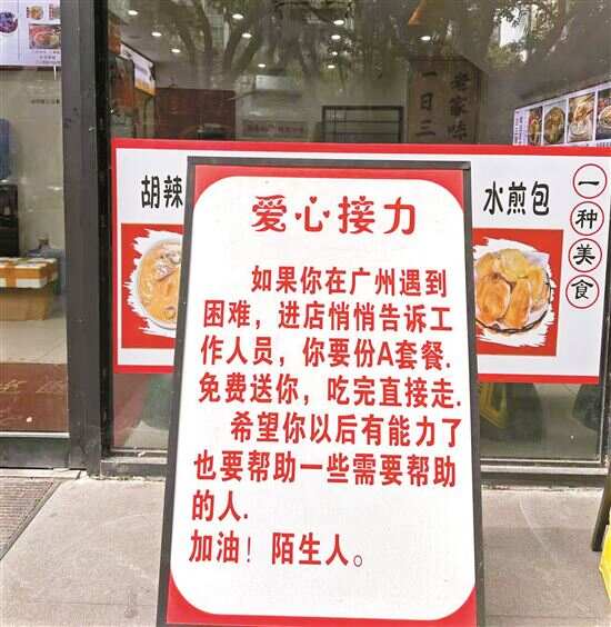 广州一份份“暗号餐”,传递店家爱心,彰显城市温暖 近日,广州番禺一家饭店为徘徊门口的少年提供免费、管饱的“2号餐”,温暖了无数人的心。从2号餐到单人套餐,再到A套餐……一份份“暗号餐”,传递着广州一家家饭店、汤粉面店的爱心,更彰显出广州这座城市的温暖。近日,新快报记者走访广州多区设置爱心餐的饭店,聆听一个个温暖故事。他们点亮的“微光”照亮着广州这座温暖的城市,吸引着更多人加入其中。 ■统筹:新快报记者 谢源源 ■文图:新快报记者 陈洁 谢源源 见习记者 金瑜 实习生 符雨 @天河区胡辣汤店 免费“A套餐”是希望对方像回家吃饭一样,不用有压力 在位于天河北路的王文红胡辣汤店门口,摆着一块牌子:“如果你在广州遇到困难,进店悄悄告诉工作人员,你要份A套餐,免费送你,吃完直接走。希望你以后有能力了也要帮助一些需要帮助的人。加油!陌生人。” 店主白冰是一名90后,她告诉记者,夫妻两人从河南来到广州创业,这家店开了半年,一共免费送出约100份“A套餐”。白冰说,虽然只是小本买卖,钱财方面帮不了别人,解决一餐粥饭汤食,帮助一下遇到困难的人是力所能及的事情。 谈及为什么称为“A套餐”,白冰说,谁都会遇到困难,但是有些人会碍于面子不好开口,用“A套餐”作为代号,是希望尊重对方,“就像回家吃饭一样”,不用有压力,有负担,不会觉得失了尊严。除了提供免费餐,该店还向环卫工人及室外工作人员提供免费饮用热水、冷水。“广州的高温天气时间长,我们店一整天都有营业,空调也是开着的,就开放给环卫工人和室外工作人员,路过时进来坐下歇歇脚,纳会凉、喝杯水。” 白冰说,选择来广州创业是因为广州是一个包容的城市、国际化的城市。作为一名6岁孩子的妈妈,白冰认为,这个小小的举动也是对孩子为人做事的言传身教。“要做孩子的榜样,教她做人做事要有情感,不要冷漠。” 是否担心吃免费餐的人太多,导致无力承受呢?白冰表示,至今没有遇到吃霸王餐的人,目前每个月支出十多份免费餐,在餐厅可控范围内。 @越秀区竹升面店 不仅提供免费“单人套餐”,还成为了信任与善意的传递站 在广州越秀区东华东路的茹意竹升面店,一份名为“单人套餐”的免费竹升面已持续提供了五年。这份温暖的餐食由老板娘常靖茹发起,专门为孤独老人、低收入人群及80岁以上长者提供帮助,“既可以完成自己开店的梦想,还可以送面给一部分人吃。” 当有年轻人到店点“单人套餐”时,茹姐什么都不过问便直接煮面,“不管他看起来是不是真的生活很困难,只要你说单人套餐我就给,我们不在乎多几碗面。”常靖茹觉得,既然来的人能拉下脸说吃这个面,可能对方真的遇到困难。 一两个月前,有个河南的中年男士到广州暂时没找到工作,到店吃了“单人套餐”后,还向老板娘借了300块钱,承诺他找到工作发工资后一定来还钱。8月25日,这名男士来到常靖茹的面店,把300元还给老板娘,还拿了水果表示感激。 店里还有一位吃免费“套餐”后成为员工的阿姨,她居住在附近,当时店内正缺人手,茹姐就让她来试一下工,现在已在店里工作了两年。茹姐告诉记者,除了来吃面的人,也会遇到一些热心顾客,他们在买单时预存100元给那些免费吃面的人。 如今,这家小店不仅用一碗面温暖无数困境中的人,还成为了信任与善意的传递站——有人因它重获希望,有人在这里找到工作,更有人主动捐款助人。常靖茹说:“既然牌子挂出来了,能帮就帮。” @海珠区素食店 认购爱心餐的好心人信任我们,我们都有责任去做好工作 新快报记者采访发现,在这些默默提供免费餐的店中,有的已经探索出一条良性循环的路子。位于海珠区的弘善素食,12年来坚持爱心餐认购,多年来送出的爱心餐已超100万份。负责人成瑞红告诉记者,一开始只是向有需要的人派发爱心餐,在媒体报道后,很多热心人士过来支持,便开始有认购的渠道。 “不少人知道我们这间店可以派饭,又可以做公益。”在店7年的店长梁红芳说,从两年前开始,该店设定一定条件免费领取餐食,低保人群、有残疾证或五六十岁但没有工作能力,可以到店登记,即会拿到一张饭卡,每天过来领取一份饭就划一份。每个月初派卡,月底收卡。爱心餐认购情况每天登记在册,每天认购多少、派出多少都有数据,若捐助人没留名字则会署以“善心人”。 如果遇到需要帮助的年轻人,则暂时不帮他开饭卡,可以免费提供几餐,帮助他渡过难关。“捐爱心餐的人希望爱心餐能帮助到真正有需要帮助的人,他们信任我们,我们都有责任去做好工作。”芳姐说。据介绍,认购爱心餐的好心人有的已经坚持多年。有时每天有几十、上百份餐被认购。领取的话一般每天约300份,数据每天更新,也会发到微博上公示。 芳姐告诉记者,好多人吃完饭后,看到桌面写着可以捐赠爱心餐,都会主动捐一份爱心餐,还有些人会捐物资过来,让爱心餐能够持续运行下去。 @番禺区爱心餐厅 餐厅不仅提供了温暖的餐食,更给了大家一份归属感 除了一些店主自发提供免费餐,在广州还有公益机构也运营着免费餐厅。 在广州市番禺区石碁镇永善村村口,由广东省蓝态幸福文化基金会开办的“蓝态爱心环保餐厅”已经运营了近八年。这里没有收款码,也没有价目表,每天为约200名60岁以上长者、残障人士和困难人士提供免费午餐。餐厅所有开支都是