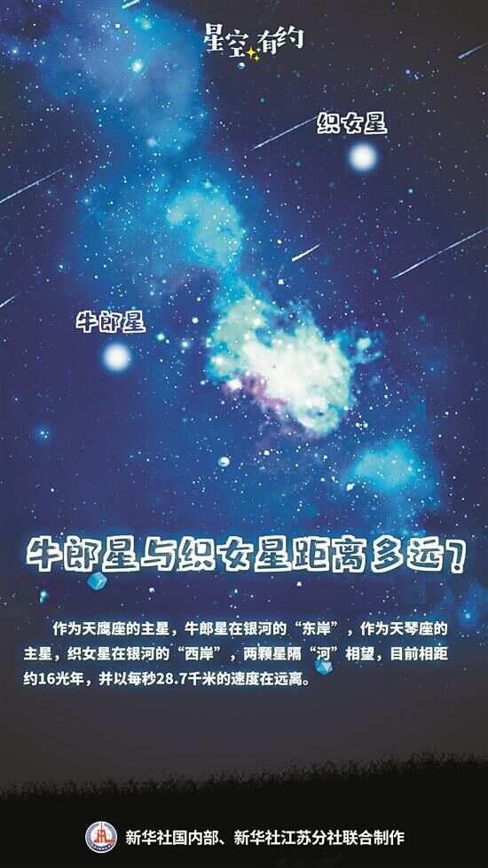 据新华社电 8月29日将迎来七夕节。在古代神话中,牛郎和织女因为被天上的银河隔开,只有在每年农历的七月初七才能通过鹊桥相会。不过在现实中,代表牛郎的牛郎星和代表织女的织女星由于相隔甚远,即便在七夕节当天也无法相会,且二者还在“渐行渐远”。 中国科学院紫金山天文台科普主管王科超说,在天文学上,代表牛郎、织女的天体分别是牛郎星和织女星。牛郎星的中文名为河鼓二,织女星为织女一,它们分别是天鹰座和天琴座的亮星。河鼓二与附近的河鼓一、河鼓三组成一个类似扁担的形状,像是牛郎的扁担。而织女一周边有四颗稍暗一些的恒星,排列的形状有点像菱形,常被看作是织女的梭子。 王科超说,作为天鹰座的主星,牛郎星在银河的“东岸”,作为天琴座的主星,织女星在银河的“西岸”,两颗星隔“河”相望,目前相距约16光年,1光年约等于9.46万亿公里。如果牛郎给织女“打电话”,织女要等到约16年后才能听到。 “不仅如此,牛郎星与织女星之间的距离还在增大。”王科超说,织女星在天球上的自行运动方向为东北偏北,牛郎星为东北偏东,二者以每秒28.7千米的速度在彼此远离,即每年距离增加约原距离的十七万分之一。但这一细微的尺度变化,仅凭肉眼还无法观测识别。 值得一提的是,随着地轴进动,曾经是北极星的织女星将来仍有机会再获北极星身份。王科超说,地球围绕着地轴转动,地轴与地球表面的交点分别是地球的北极点和南极点。在1万多年前,地轴曾经指向织女星附近,这使得织女星成为那时的北极星。目前,地轴正指向勾陈一,即现在的北极星,但在1万多年之后,地轴或将再次指向织女星附近,届时这颗亮星将再次以北极星的身份存在。 “若织女星再次成为北极星,它将常年位于天空中相对固定的位置,不像现在这样仅在特定季节容易观测。”王科超说,届时牛郎星出现的时间也会变长,从地球上看,会呈现出牛郎星围绕织女星旋转的景象。同时,最璀璨的银河中心部分也会在一年中的多数夜晚可见。