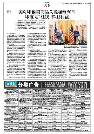 美对印输美商品关税加至50% 印度划“红线”捍卫利益