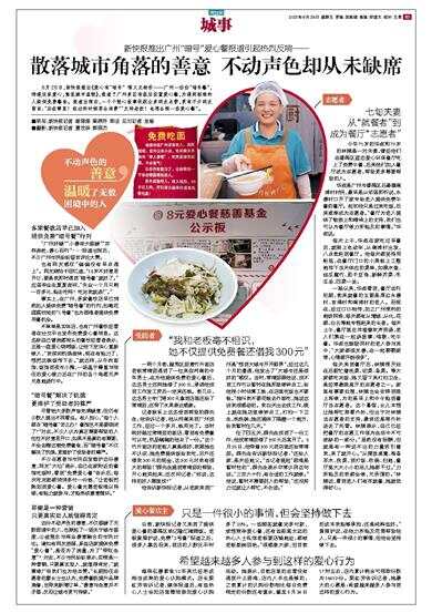 新快报推出广州“暗号”爱心餐报道引起热烈反响—— 8月28日,新快报推出《爱心有“暗号” 情义无标价——广州一份份“暗号餐”,传递店家爱心,彰显城市温暖》,报道了广州多区有饭店设置爱心餐,