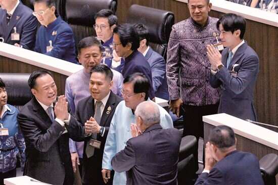 ■9月5日,在泰国曼谷国会下议院,泰国自豪泰党党首阿努廷(左下)接受祝贺。新华社发 |