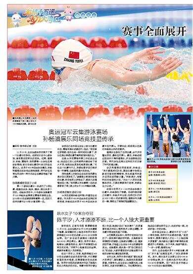 奥运冠军云集游泳赛场 孙杨潘展乐同场竞技显传承 ■采写:新快报记者 王敌 11月10日,全运会游泳项目展开了第一个比赛日的争夺。在深圳大运中心游泳馆,诸多奥运冠军先后到来。汪顺
