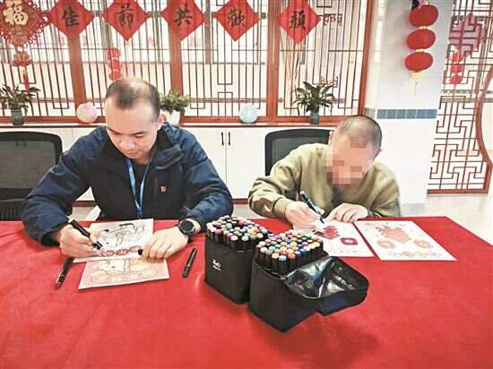 ■新春联欢活动中,工作人员与受助者一同绘制马年图画。 |