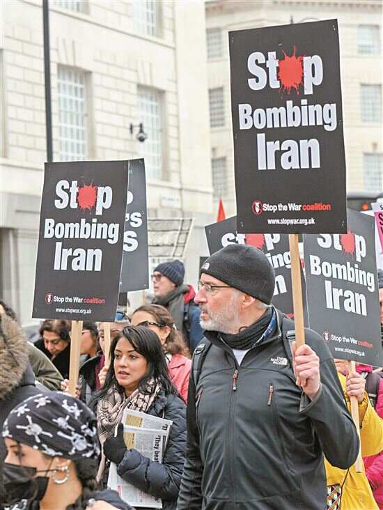 ■3月7日,在英国伦敦,人们参加示威活动,抗议美国和以色列对伊朗发动军事打击。新华社发 |