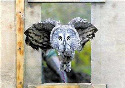 俄罗斯克拉斯诺雅茨克,一只1.5岁的大灰猫头鹰飞出巢穴的瞬间。
