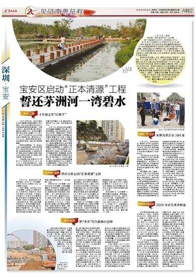 6月15日,茅洲河流域(深圳宝安片区)“正本清源”工程项目正式开工,项目将在2018年12月31日前完工。5天后的6月20日,茅洲河(宝安段)河长会议在松岗街道紧锣密鼓地召开,会议就推进茅洲河(宝安段)治理工作进行研究和部署。宝安区如此大刀阔斧的行动,为的都是兑现一个承诺:“2018年底茅洲河(宝安段)‘1+18’条干支流基本工程全部完工,实现不黑不臭;2020年茅洲河(宝安段)达到地表水五类水标准。”