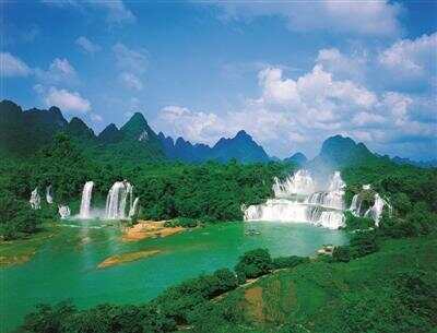 德天的水量在6月到10月间最大,在此期间,因河水涨溢,瀑布激流如排山倒海冲泻而下,由于瀑布地处峰林平原河道,游人可以走进瀑布,看其形、听其声,一边呼吸着清新至极的空气,一边享受被漫天水雾笼罩的惬意。