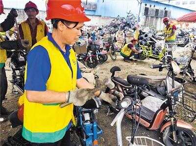 广州物资再生公司的工作人员正对车辆进行拆解。“我们大概有30个工人,每天工作不少于8小时,一天能拆六七百台车。”一名工作人员说。现场“叮叮当当”,他们用铁锤将车上的塑料、不锈钢金属支架、扶手胶、软皮坐垫逐一敲下,分类后进行回收,并清理摩托车油箱中残余的柴油、机油。而就在这时,远处“咣当”一声响起,报废场中间一台钩机的长臂,抓起几辆车重重摔在地上,并一次次落地捶打,直到将车辆破解掉。