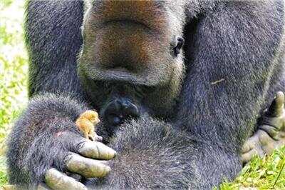 非洲一家致力于救助濒临灭绝大猩猩的非营利组织——Action Africa,在森林保护区里拍到了一个有趣的画面:一只名叫Bobo的24岁雄性大猩猩,和一只还没有它手掌大的野生灌丛婴猴成了好朋友。大猩猩常常把这只灌丛婴猴捧在手心里凝视,眼神里满是关爱。工作人员称:“有一天早上,我们在例行检查时,发现Bobo手上抱着一只很小个的野生灌丛婴猴。这只灌丛婴猴显然一点都不害怕Bobo,它还与Bobo互动,时而在周围的草地上跳来跳去,时而又回到Bobo的身边。”
