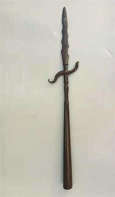 ▶精钢蛇矛,或曰蛇镰枪 此蛇矛为较罕见的明末清初南方官造长兵器制式,长度达70余厘米,全器以精铁打造,器型颀长壮硕,颈箍为铁雕宝瓶状。矛刃是在剑型双刃上错位开出凹口形成曲刃。为不可多得的南方长兵器代表 (徐兆前藏品)