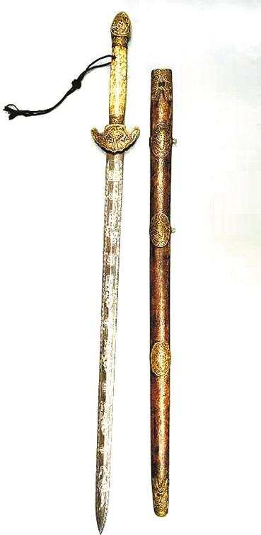 ◀清代礼仪佩剑 剑长112cm,剑身鋄银两面各有四位仕女,动态各异,剑身有《大清乾隆年制》字样。剑柄为象骨,上刻有戏剧人物故事。剑鞘饰鲛鱼皮。此剑为海外回流 (徐兆前藏品)