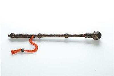 ▲宋代虎首战锤 此锤为宋代武官配备实战铁杆铜锤,全长约45厘米。点睛之笔是柄端的铸铜虎首,俯视角度具有拟人化的胡人面视觉,细观虎口前吐出一花蕾,暗合“心有猛虎细嗅蔷薇”的刚柔两面性 (林海藏品)