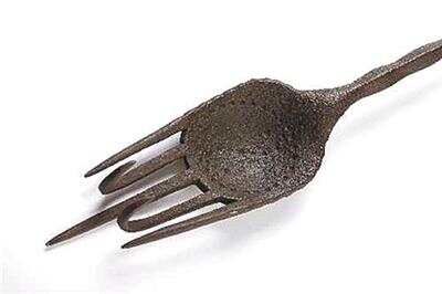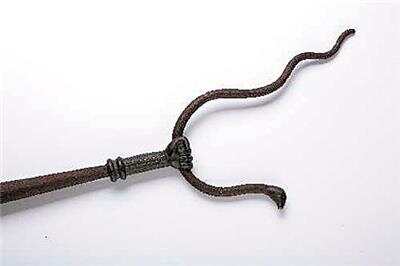 清代龙吞阴阳抓 此抓为清代武林流派定制奇门兵器,全长约70厘米。前端为沉实的阴阳铁掌,两指内弯成钩,三指前伸为刺,兼具拍击勾拿突刺之妙用,构思诡异充满个性化 (林海藏品)