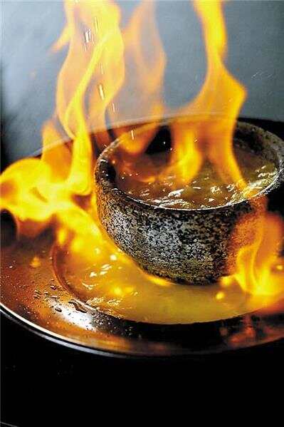 中外食材的融合,往往会碰撞出美妙的火花。“松露酱滑珍珠烩花胶”便是其中一个代表。激发吴师傅创作灵感的是海鲜龙虾泡饭,汤底鲜甜米饭香脆,但是油炸过的米却容易上火不宜多食。吴师傅想要呈现一道能满足更多人口味的主食。他首先研发了营养丰富的金瓜汁汤底,入口甘甜而后味清爽。然后便开始了寻觅米饭的漫漫长路。直到一次去泰国旅行,机缘巧合下尝到当地一种珍珠米,才找到了寻觅已久的质感。这种泰国珍珠米软糯弹牙,久煮不烂,配合火焰石锅的形式上桌,温热醇和的口感令肠胃极其舒服。而高温加速了分子运动,又使得黑松露酱的独特香气更加勾魂。