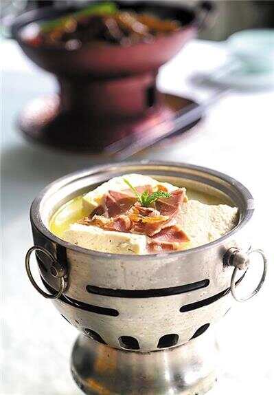 不说不知道,酸汤除了做火锅底料,还是贵阳人“点”豆花的私家佐料。以酸汤未添加配料前的酸水代替石膏“点”豆花,除了不会有恼人的碱味,还可以令豆花口感更嫩滑。不过豆花本身是没有味道的,像“传统菜豆花”这道菜,就是通过不同口味的蘸水增添风味。而豆花与其他食材烹煮,同样可以演绎出多种风味。与金华火腿、宣威火腿并称“中国三腿”的贵州威宁火腿,就是豆花的好拍档之一。将片成薄片的威宁火腿与贵阳豆花一起放到高汤里烹煮,火腿的咸甜令汤汁的味道更加鲜美,在文火慢炖的过程中,滋味充分融入到豆花中去,清香美味。
