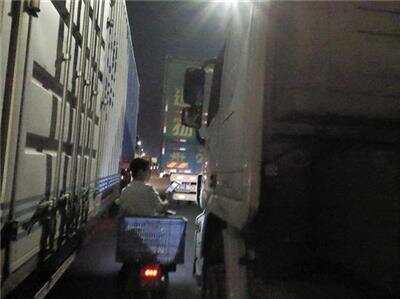外卖小哥穿梭在货车与货车狭小的缝隙里给司机送餐
