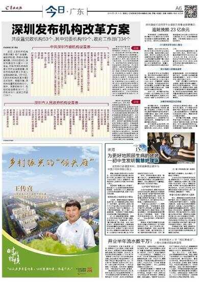 近日,《深圳市机构改革方案》经广东省委、省政府批准,并报中央备案同意。1月8日至9日,深圳市委召开六届十一次全会,对全市深化机构改革工作作出全面部署,深圳市机构改革工作进入全面实施阶段。1月10日,《深圳市机构改革方案》正式发布,根据方案,深圳共设置党政机构53个。其中,党委机构19个,包括纪检监察机关1个,工作机关18个;政府工作部门34个。