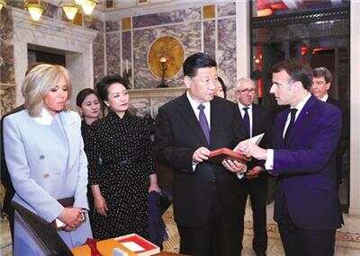 3月24日,国家主席习近平在法国尼斯会见法国总统马克龙。会见前,马克龙向习近平赠送1688年法国出版的首部《论语导读》法文版原著 新华社发