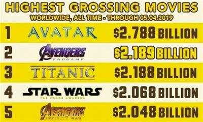 据外媒报道,《复联4》凭借全球21.89亿美元票房的战绩,已经超过了1997年上映的《泰坦尼克号》21.88亿美元的全球票房,名列影史票房第二位,仅次于全球票房收入27.88亿美元的《阿凡达》。有趣的是,《泰坦尼克号》和《阿凡达》都是詹姆斯·卡梅隆导演的作品。