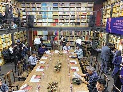 没想到第二天,在天津大学冯骥才文学艺术研究院内,还有新的惊喜。大冯这个学院建筑设计太漂亮了,处处显示着高级的美感,尤其“冯骥才记述文化五十年国际研讨会”现场——大树书屋,更是美轮美奂。四周围成一圈的书架,上下两层,书架上的书更是讲究,文学、艺术、民俗、画册、经典、全集,等等,如此书香浓郁的场景,让人觉得开会都不是个差事。