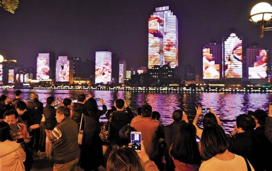 ◀珠江北岸24栋建筑外墙上演灯光动画,市民拍照留念(资料图) 羊城晚报记者 周巍 摄