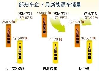 具体的数据方面,7月,新能源汽车产销分别完成8.4万辆和8万辆,比上年同期分别下降6.9%和4.7%。其中纯电动汽车生产完成6.5万辆,比上年同期下降4.8%,销售完成6.1万辆,比上年同期增长1.6%;插电式混合动力汽车产销分别完成2万辆和1.9万辆,比上年同期分别下降13.2%和20.6%。