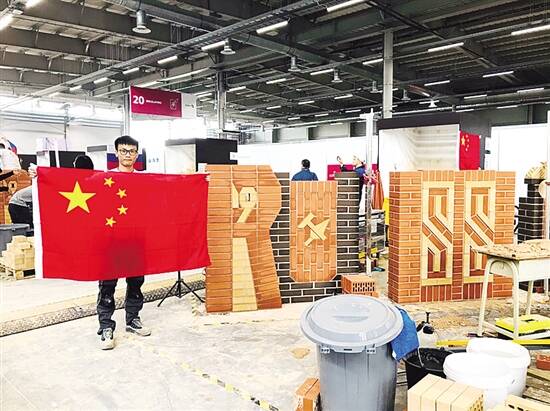来自广东的砌筑高手陈子烽把砖墙砌出了“花” 通讯员供图