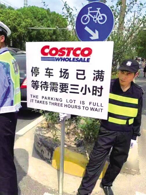 羊城晚报记者留意到,早上9点正式营业时间一到,Costco的停车场就已经停了将近一大半,不少上海市民抢着来尝“头啖汤”。10点半左右,记者收到了Costco的会员提醒短信,提示目前为高峰购物阶段,建议错峰前往购物。前往Costco的导航地图则显示,商场周围的道路全是一片红。11时左右,Costco停车场亮出提示牌显示车位全满,等待需要三小时。中午时分,商场开始限制客流。