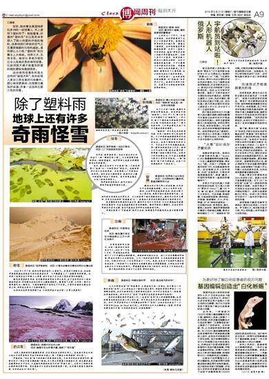 早前,媒体爆出美国科罗拉多州的一桩怪事儿:天上居然下塑料雨了!细细看来,所谓的“塑料雨”不过是雨水中混入了细小的塑料纤维和微粒,这表明我们呼吸的空气正在遭受微塑料污染的威胁。虽然很让人心烦,“塑料雨”却还算不上太奇葩。世界之大,无奇不有,地球N多地方都有过令人匪夷所思的奇雨怪雪,比起用放大镜才能看到的塑料微粒要惊悚悬疑得多。
