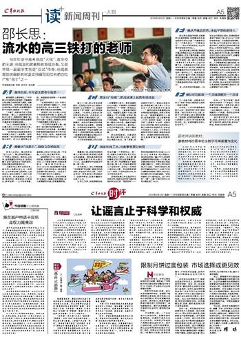 不少学生的课桌上可以见到一本薄薄的小册子,费孝通著的《乡土中国》。不是课本,但却是邵老师的另一个“例牌”:即使在分秒必争的高三,一直到高考前的五月,他都要从每周六节语文课里拿出一节,不讲题、不考试,就上阅读。比如《乡土中国》就是这个月的读物。“我要学生们从中抽取一篇来分析内容,推敲作者收集资料并论证的方法,最后每人从自己的观察出发,也写一篇类似社区中国、小镇中国这样的文章。”