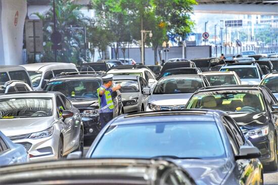 广州南站周边易发生拥堵,交通协管员在车流中疏解交通 羊城晚报记者 黄巍俊 摄