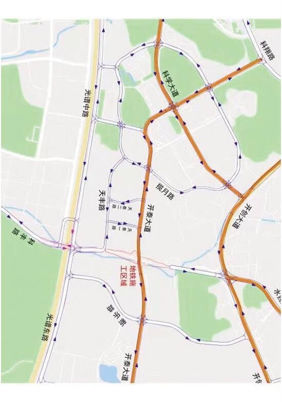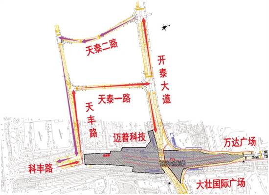 1、天泰一路改为南往北四车道单行,使科丰路进入开泰大道形成科丰路→天丰路→天泰一路→开泰大道绕行方案;